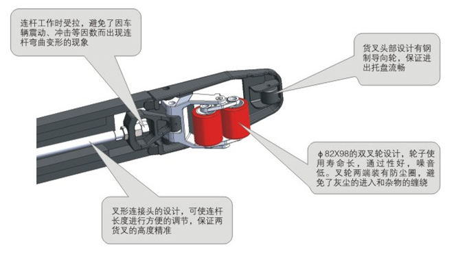■ 貨叉頭部設(shè)計(jì)有導(dǎo)向輪,進(jìn)出托盤順暢。